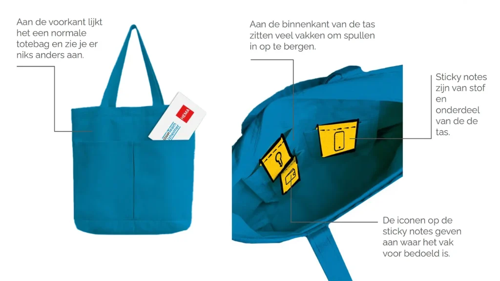 Team Alzheimer lanceert samen met HEMA de Bij-de-handtas: een shopper met vakken en iconen voor spullen die je snel vergeet. De iconen zijn vormgegeven als stoffen sticky notes, geïnspireerd op hoe mensen met dementie zichzelf vaak helpen herinneren. Met de verkoop van de tas haalt Team Alzheimer geld op voor onderzoek naar dementie.